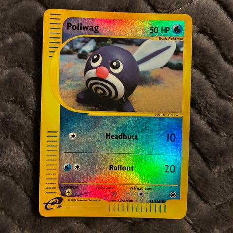 Pokémon Poliwag samlekort med vann-type angrep Water Gun. Kortene har illustrasjon av Poliwag og er en del av Pokémon-kortspill.