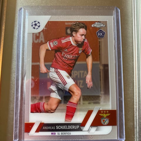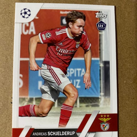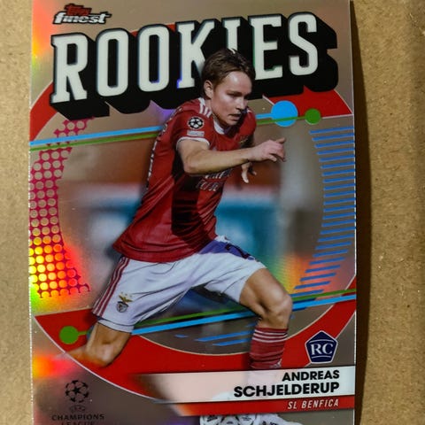 Topps Finest Andreas Schjelderup fotballkort med bilde av spilleren i SL Benfica-drakt. Kortet viser spillerens navn og klubb, samt diverse fotballrelaterte logoer og informasjon på baksiden.