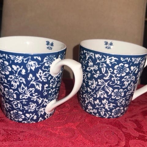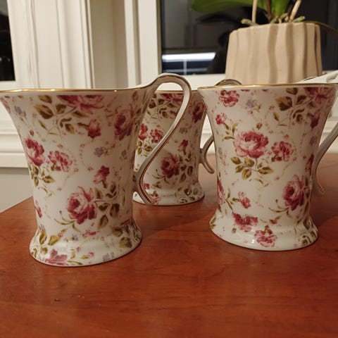 To blomstrende og fargerike kopper fra Laura Ashley. Tror de er ment som tekopper, men de kan like gjerne brukes til suppe eller grøt. Kan godt brukes til å sette telys i, eller til å legge fra seg smykker i. Selger begge samlet for 300 kr.