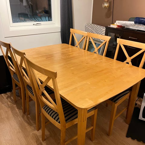 Spisebord fra IKEA + 8 stoler fra Møbelringen.
