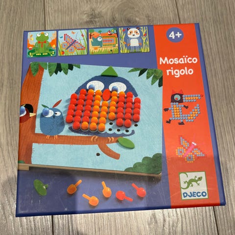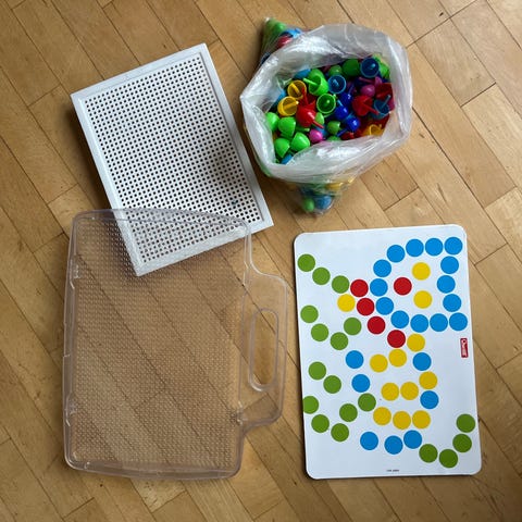Plasto barnespill med brikker i flere farger inkludert gul, grønn, rød, lilla og oransje. Brikkene er laget av plast og egnet for barn.