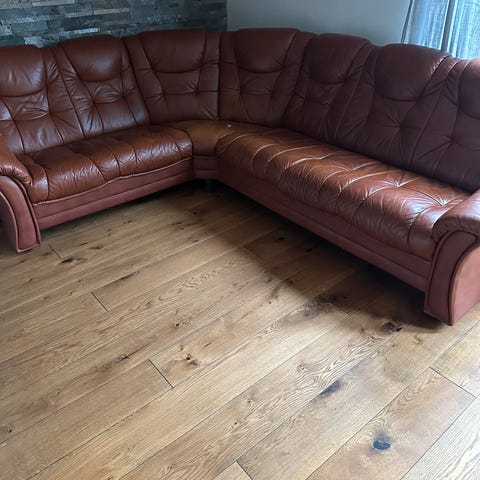 Skinn sofa selges rimelig da den er litt gammel, men er fortsatt brukbart.