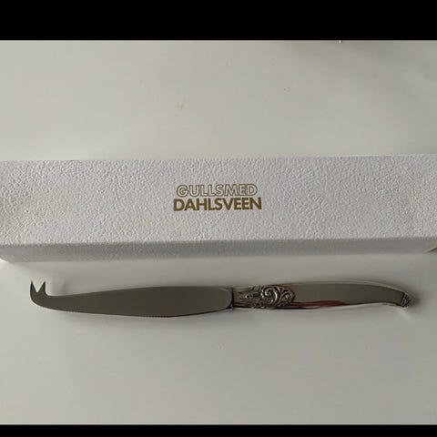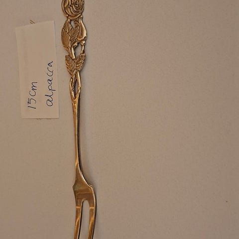 Nydelig koldgaffel eller cocktailgaffel, også kjent som en sjømatgaffel, forrettsgaffel, eller kakegaffel. Den har en uthevet rose og blader på håndtaket, som ligner litt på "Opphøiet Rose".