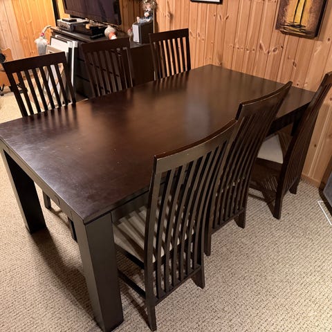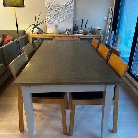 Trenger litt kjærlighet og pleie, så blir det så godt som nytt. Bruksmerker i bordplaten kan enkelt slipes for å få «ny» overflate.