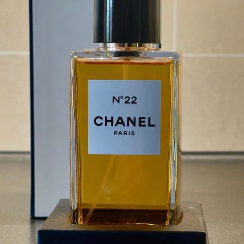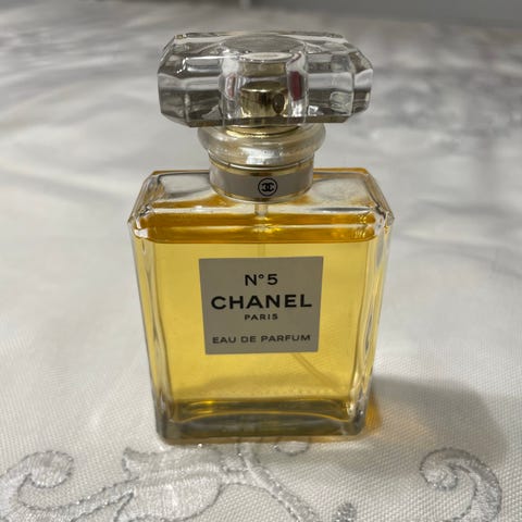 Chanel N°5 sett bestående av Eau de Parfum og Body Lotion. Eau de Parfum kommer i en glassflaske med spray, og Body Lotion i en plastflaske. Begge produktene har klassisk design og er pakket i original emballasje.