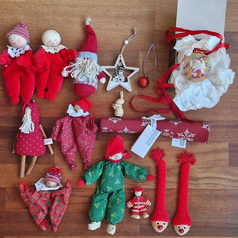 Seks søte sprellemenn og damer til å henge på juletre eller lignende.