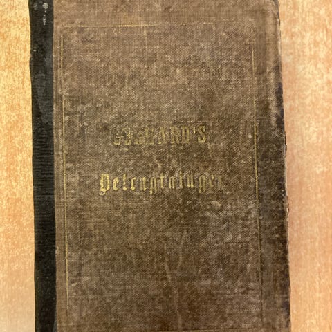 Korsets Evangelium bok med tekst på norsk. Boken har en slitt og antikk innbinding med synlige tegn på bruk og alder.