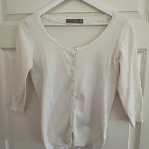 Delikat jakke / genser ZARA kort modell med pene detaljer. Marsipanfarger. Armhule til armhule 50 cm, hel lengde 49 cm. Vasket en gang på 30 grader. Kan sende om du ønsker det.