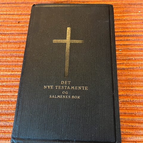 Det Nye Testamente bok med svart omslag og gullfarget tekst på forsiden. Boken inneholder religiøse tekster og er utformet i et lite format med detaljerte sider.