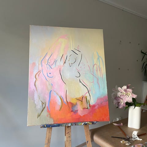 Vakkert oljemaleri av Ukrainsk kunstner som viser to personer i dyp omfavnelse i abstrakt form.