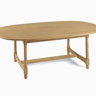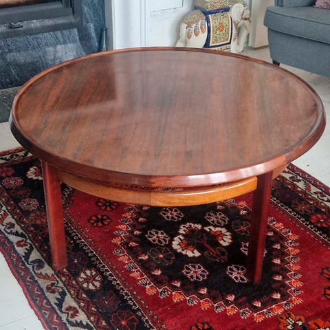 Pent brukt salongbord fra Bruksbo, designet av Torbjørn Afdal og produsert av Mellemstrand på Jæren. Modellen heter Lotus, og er i såpevasket japansk eik - heltre. Bordet virker så solid at det kan vare til tidens slutt.