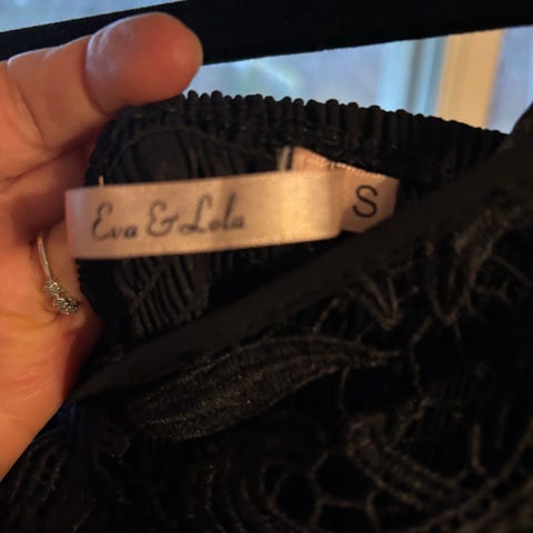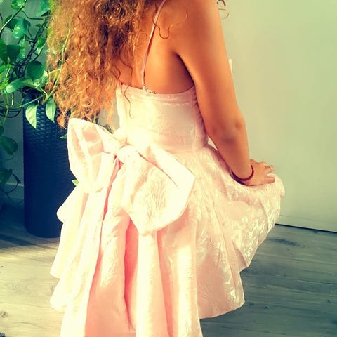 Kjempe fin kjole , med strass nederst på armene som gjør den elegant og pen . Går til midt på låret el litt over kneet. Glidelås i ryggen.