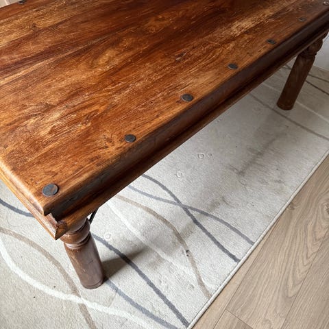 Noe små bruksmerker. Bordet har glassplate, fire skuffer og en praktisk hylle under.
