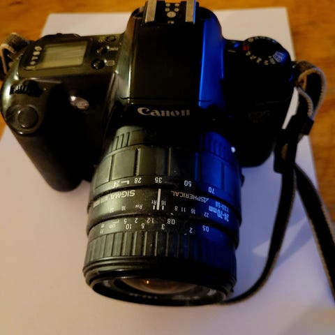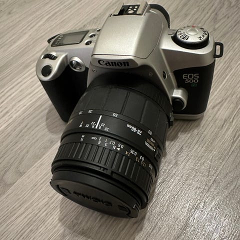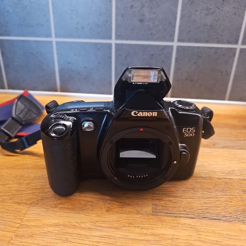 Kamera er ett analogt Canon EOS 500n. Se bilder.Følger med 2 linser samt egen veske. Bud mottas.