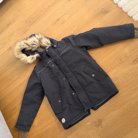 Mørkeblå ytterjakke fra Svea str 170. God og varm i vinter, med deilig hette. Fin i kaldt vintervær.