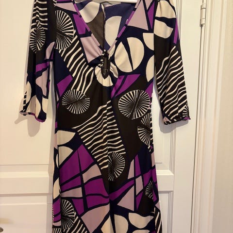 Vila tunika i størrelse L for dame, laget av viskosemateriale. Kjolen har lilla farge og et mønstret design. Knapper i halsen og strechy stoff. Den er egnet for hverdagsbruk og festligheter. Det står størrelse xl, men den er liten i størrelsen. Har lagt til mål på bildene. Som ny!