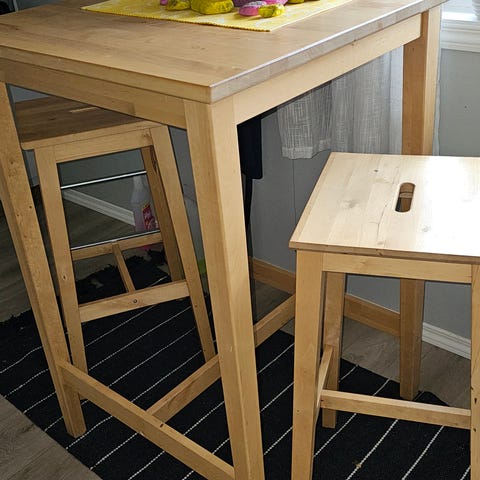 To stk pent brukt NILSOLLE barstol/kjøkkenkrakk fra IKEA. Laget i heltre bjørk med solid konstruksjon og metallbeskyttelse på fotbrettet, som gir god slitestyrke og lang levetid.