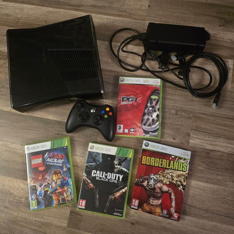 Xbox 360 S med 4 spill, 1 kontroll og alle kabler selges i en fin pakke for oppstarten.