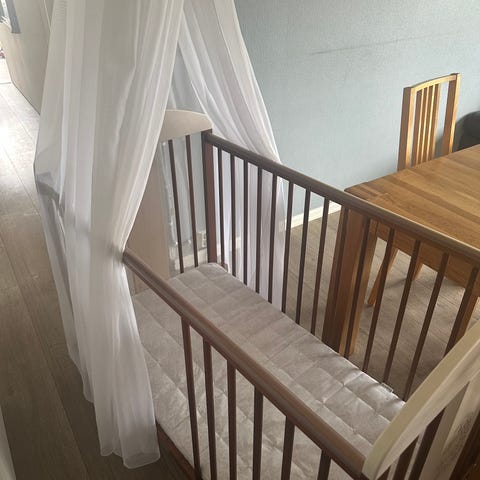 IKEA Sprinkelseng barneseng i hvit farge. Passer for små barn og har spiler på alle sider for sikkerhet og god ventilasjon.