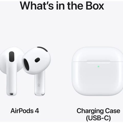 Apple AirPods 4 trådløse hodetelefoner i hvit farge. Inkluderer ladeetuiet. Designet for trådløs bruk med enkel tilkobling til kompatible enheter.
