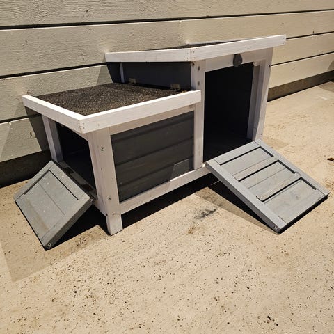 Romslig kaninhus som er brukt til store franske vedder kaniner. Enkelt å gjøre rent siden taket kan åpnes.