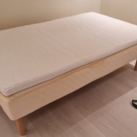 Seng fra Jensen gis bort mot henting. Sengen er i god stand, selv om den ene sengevangen har vært knekt og blitt reparert. Dette synes ikke fra siden eller oversiden, og kjennes ikke når man bruker sengen. Se bilder.