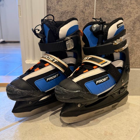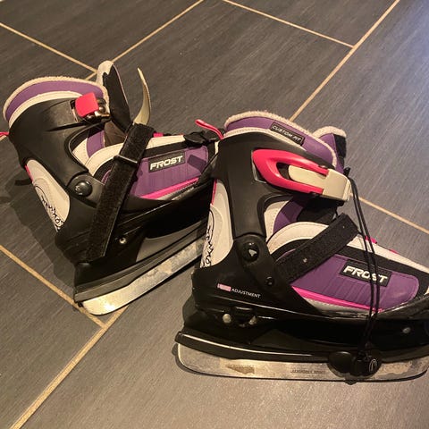 Frost Pro-XT ishockeyskøyter for barn i størrelse 29- 32. Skøytene har justerbar passform og kombinerer materialer i svart, lilla og rosa.