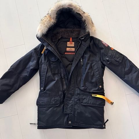 Parajumpers Jakke i blå farge, størrelse L for herre. Laget av nylon materiale. Jakken har hette med avtagbar pelskant.