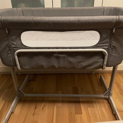 Moweo Blake Bedside Crib, pent brukt. Helt super bedside crib med hjul. Selges fordi sønnen vår har vokst ut av den. Kjøpt ny av oss i februar 2025. Bånd til å feste til seng følger med, ubrukt. To stretchlaken som passer kan også følge med om ønskelig.
