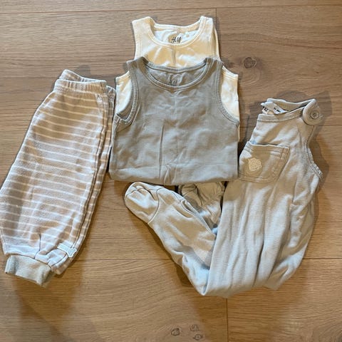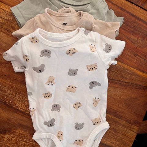 To kortarmede bodyer, en helt hvit og en med løvemotiv. En kortarmet pysj med elefanter. Pent brukt, str 62.