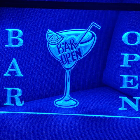 LED "neonaktig" lys skilt med inngravert motiv. Motivet har 3D effekt, da den er inngravert med 3D teknologi. Dette gjør også at motivet blir tydelig fra flere vinkler. Metallkjede for opphenging følger med til alle skilt.