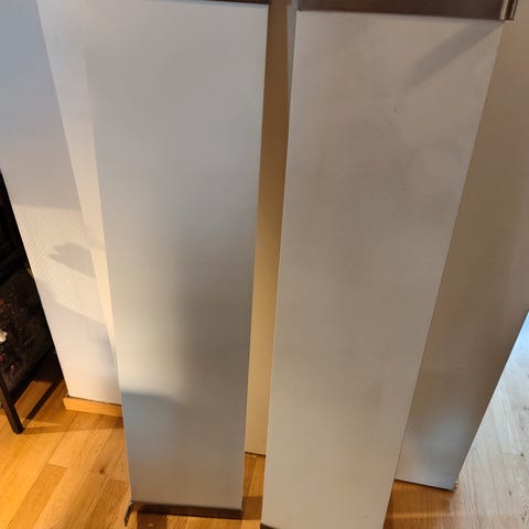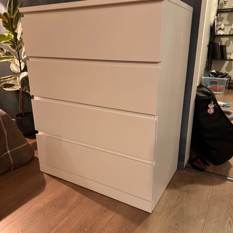pent brukt i ca 3 år til oppbevaring av klær. fikk noen skrammer i høst under flytting. den ene skuffen har et lite hakk, og et par hakk på veggen nederst ved gulvet. den andre kommoden har fått en skrape på benkeplaten som vanligvis står inntil veggen. tenker at det ikke er verre enn at det kan ordnes med en liten pensel og litt maling om man ønsker det.