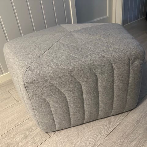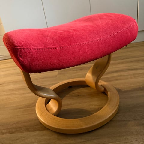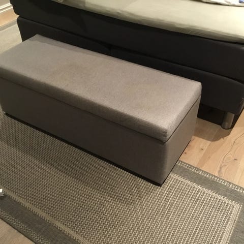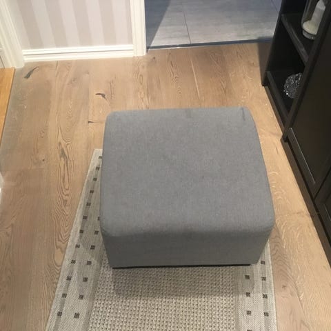 Stolen er lite brukt og i god stand. Pallen har ødelagt bunn, knekk i toppen og gjenger til "føttene" til toppen er borte. Kan brukes, men toppen ligger løst oppå. Trekket er pent brukt. Selges kun samlet, må hentes.