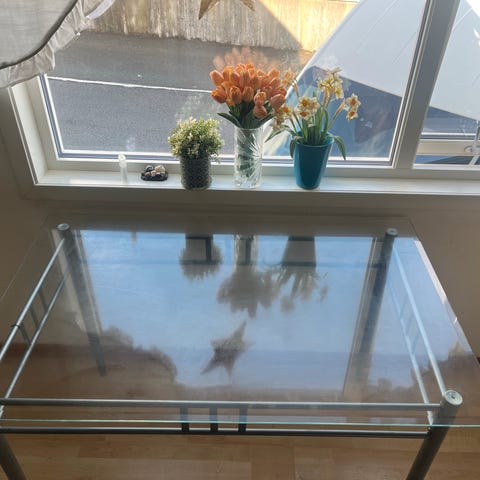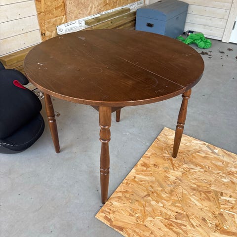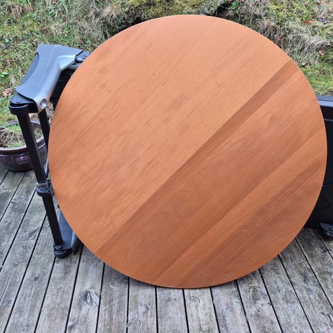 Bordplaten er 80 x 80 eller 140 x 80 når man trekker klaffene ut. Det er 75 cm høy. Bein kan skrus av for transport.