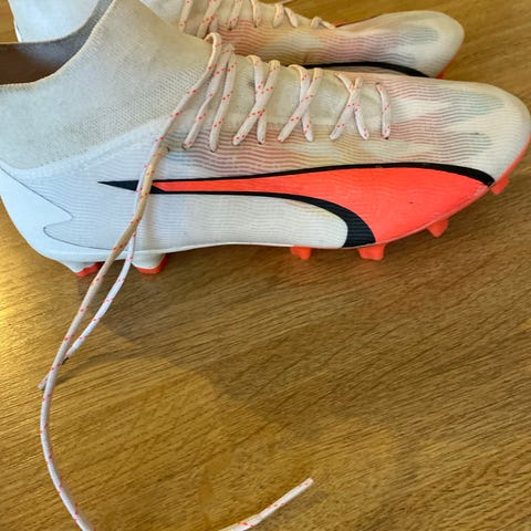 Puma fotballsko i størrelse 43 med svart og oransje farge. Skoene har knotter på yttersålen for bedre grep på kunstgress og gressbaner. Designet for bruk til fotballspill.