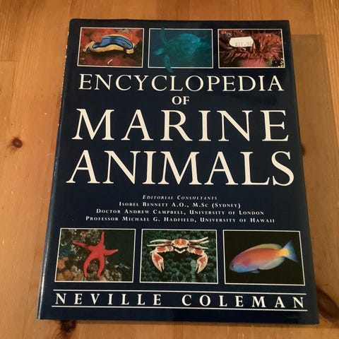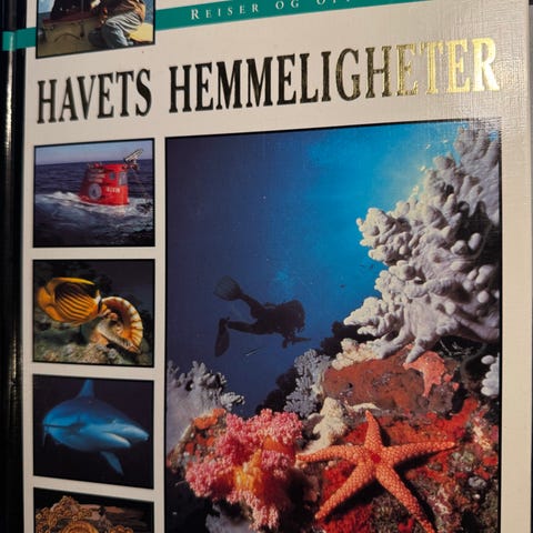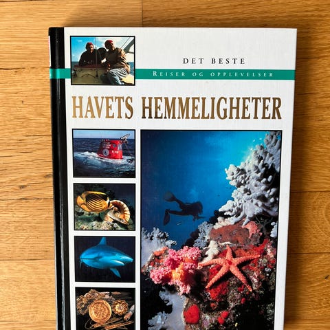 Boken 'Havets Hemmeligheter' inneholder informasjon og bilder relatert til havets liv og økosystemer. Den har et omslag med undervannsbilder og illustrasjoner av marine organismer.