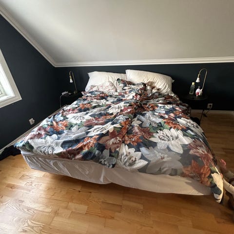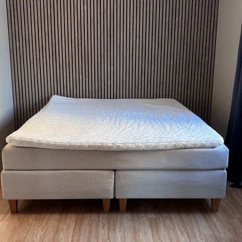 Sengen gis bort pga flytting. Den er B99 x L205 x H75 cm. Kjøpt fra jysk og passer til ramme-, skum- og vendbare madrasser 90x200 cm