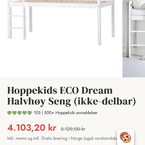 Hoppekids loftseng i god stand. Få bruksmerker, men klister fra klistremerker henger igjen noen plasser (har prøvd å ta bilde av det, men litt vanskelig å få tydelig frem). Kjøpt brukt for ett år siden. Ny pris (hos Bohus) 3999kr.