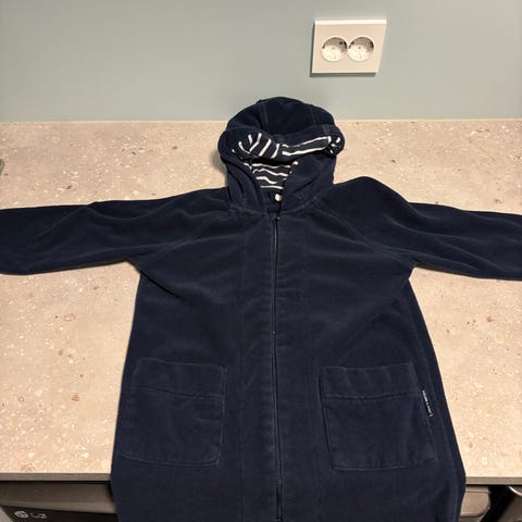 Fin og myk badekåpe til barn i mørkeblått frottéstoff. Den har hette, glidelås, knytebelte i livet og to praktiske lommer foran. Perfekt til etter bading eller kosestunder. Passer for barn til ca 5 år.