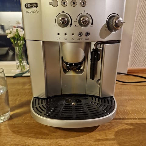 DeLonghi Magnifica S espressomaskin med svart og metallfarget design. Maskinen har flere kontrollknapper og en steamstav for melkeskumming. Passer til hjemmebruk for å lage espresso og melkebaserte kaffedrikker.