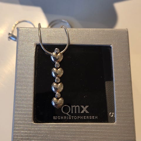 Sølv smykke med stort hjerte anheng med zirkonia stener. Stemplet 925 både på anheng og kjedet. 3 rader slangekjede .pent brukt. Kommer I eske