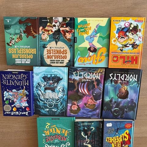 Nordlys Portalenes bok 3 er en barnebok med illustrert omslag. Mikoline er en barnebok med tema knyttet til fantasi og eventyr. Operasjon Lurifaks er en detektivbok for barn. Marshmallows-maskinen er en barnebok med illustrasjoner og eventyrtema.