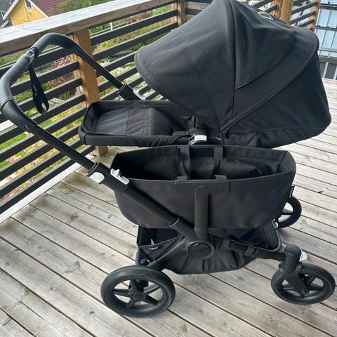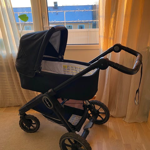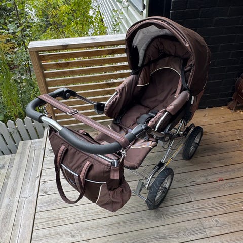 Medfølger originalt regntrekk og myggtrekk. Kan medfølger voksing vinterpose om ønskelig.