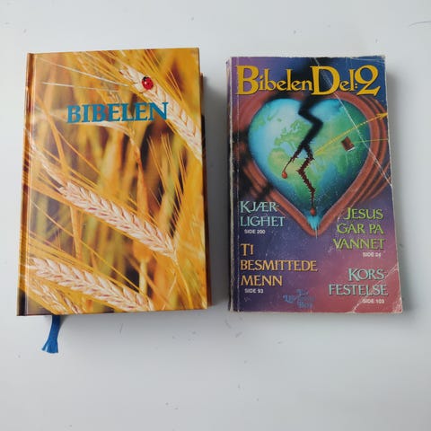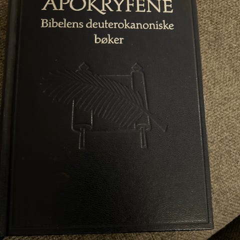 Bibelen Den hellige skrift bok med tekst på norsk, inneholder Det gamle og Det nye testamente. Boken har en svart dekorativ innbinding med preget mønster på omslaget og rygg.