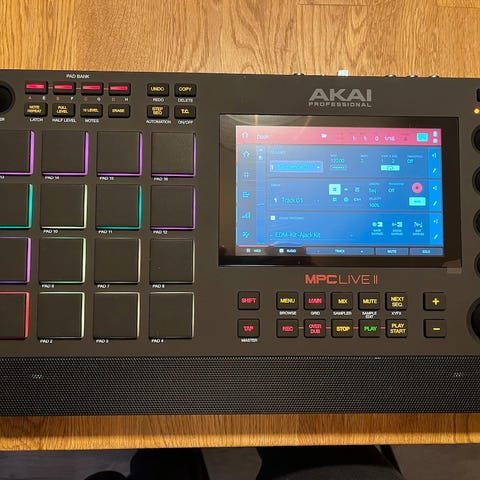 Akai MPC One musikkproduksjonsenhet med innebygd skjerm og 16 trykkfølsomme pads. Enheten har flere kontrollknapper og hjul for justering av parametere. Designet for musikkproduksjon og sampling.