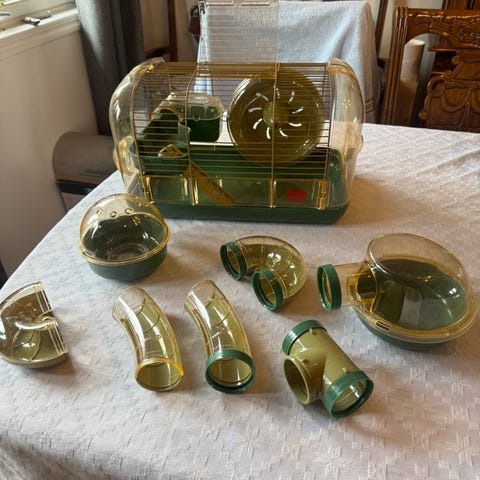 Hamsterbur med plastbunn, stige, hus og klatrestativ. Passer til små gnagere som hamstere. Bur og tilbehør i ulike materialer som plast og tre.