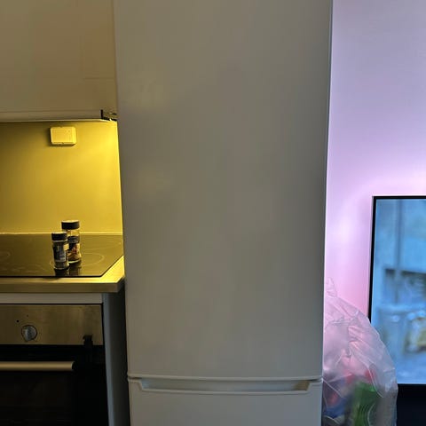 Pent brukt Matsui kombiskap i hvit farge med beige håndtak. Kompakt størrelse som passer til mindre kjøkken eller områder med begrenset plass. Inneholder både kjøle- og frysefunksjon med enkel innredning bestående av hyller og fryseboks.