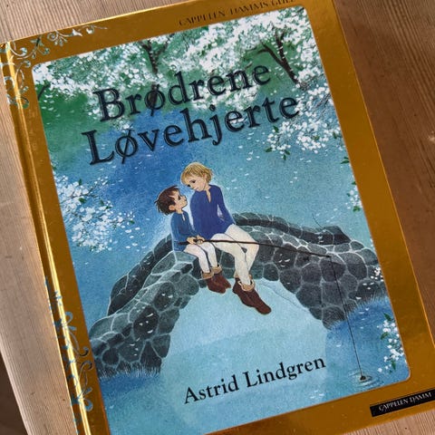 Astrid Lindgren Brødrene Løvehjerte bok. Originalutgave utgitt av Damm & Son A/S i 1979. Inneholder fortellingen om brødrene som opplever eventyr og utfordringer i Nangijala. Boken er som ny