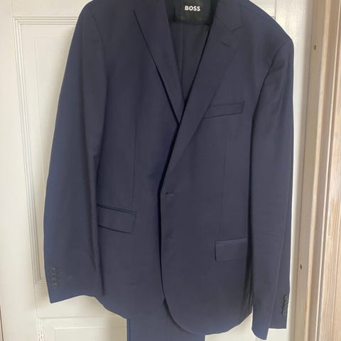 Hugo Boss dressjakke og bukser i blå virginull. Passer herre, størrelse 48. Dressen består av jakke og bukser med elastisk midje for komfort. Knapt brukt, selges fordi den er litt stor for nåværende eier.