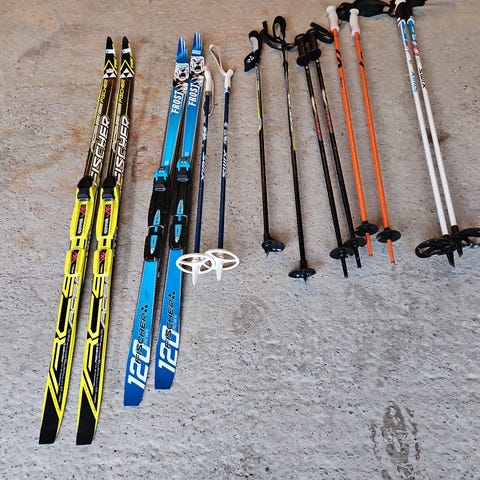 Kun to par ski igjen. Lengde 140 cm og160 cm selges, kr 100,- pr par. Har også igjen ett par staver som kan medfølge hvis det er ønskelig, i lengde 95 cm.